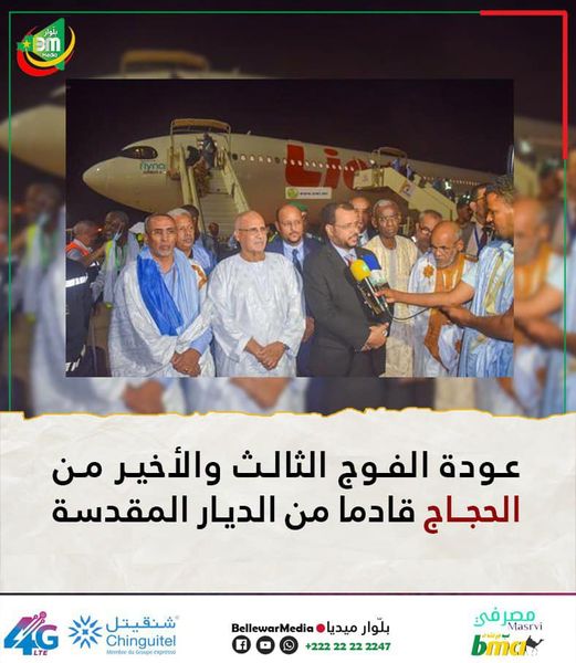 عاد الليلة البارحة إلى نواكشوط الفوج الثالث والأخير من الحجاج الموريتانيين قادما من الديار المقدسة بعد أن أدى فريضة الحج للعام الهجري 1443، وقد ضم هذا الفوج، البالغ عدد أفراده 415 حاجا، البعثة الرسمية برئاسة وزير الشؤون الإسلامية والتعليم الأصلي.