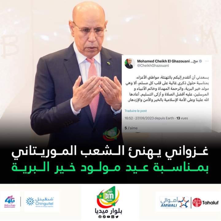 هنأ رئيس الجمهورية محمد ولد الشيخ الغزواني الشعب الموريتاني بمناسبة حلول ذكرى مولد المصطفى صلى الله عليه وسلم.