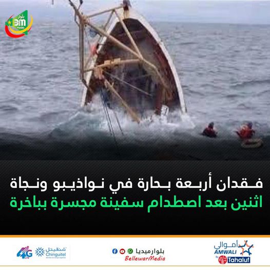 أسفر اصطدام سفينة مجسرة كان على متنها بحارة بإحدى البواخر في المياه الموريتانية، عن فقدان أربعة بحارة، فيما تم فقدان اربعة آخرين مازال البحث جاريا عنهم حتى اللحظة.
