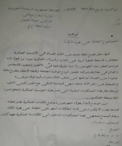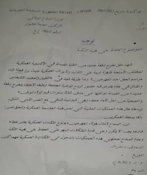 كما دعا قادة التشكيلات إلى «السهر على الحفاظ على هيبة الثكنة، وعدم السماح لممتهني هذه المسلكيات بالدخول إلى الثكنات العسكرية مهما كانت الدعاوى والظروف».