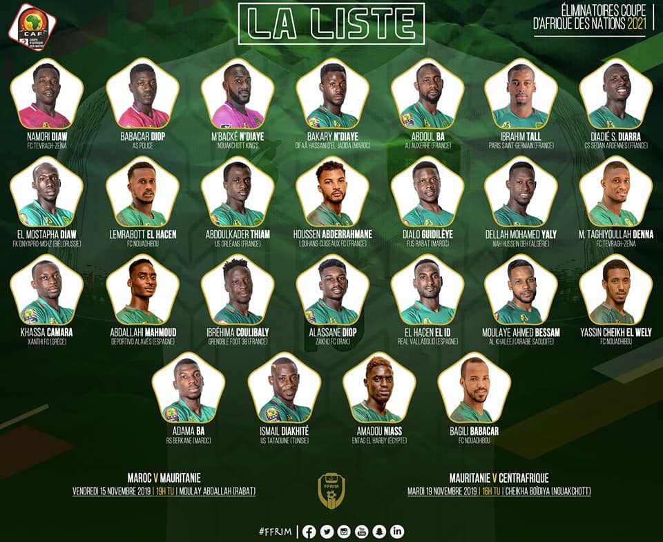 وشهدت القائمة استدعاء لاعب نادي باريسانجرمان الفرنسي إبراهيم تال لأول مرة مع المنتخب الوطني، وكذا الحال بالنسبة لحارس نواكشوط كينغس انجياي امباكي الذي ينضم للمنتخب الأول لأول مرة في مشواره.