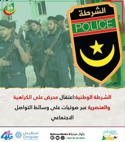 قالت الشرطة الوطنية إنه وعلى إثر تداول تسجيلات صوتية على بعض منصات التواصل الاجتماعي خلال الأيام الأخيرة ، تتضمن ما قد يفهم من أنه تحريض على الكراهية والعنصرية حسب وصفها ، وتوجيه شتائم على أساس اللون والأصل الوطني .