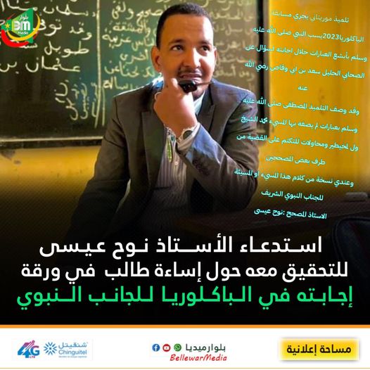 قال الأستاذ نوح ولد عيسى إن الجهات المعنية استدعته للتحقيق معه حول منشور على صفحته على الفيسبوك تحدث فيه عن اساءة طالب في الباكلوريا للجناب النبوي.