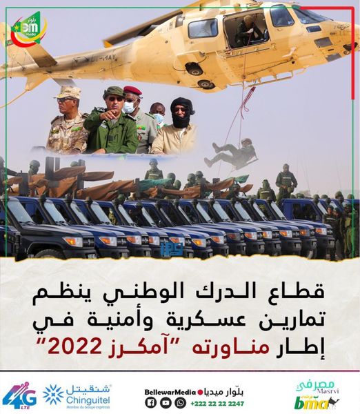 نظمت قيادة أركان الدرك الوطني في إطار مناورتها السنوية “آمكرز 2022”، اليوم الثلاثاء، بمنطقة تنويش شرقي العاصمة تمارين عسكرية وأمنية، بإشراف من وزير الدفاع الوطني حننه ولد سيدي رفقة قائد أركان الدرك الوطني الفريق عبد الله ولد أحمد عيشه.