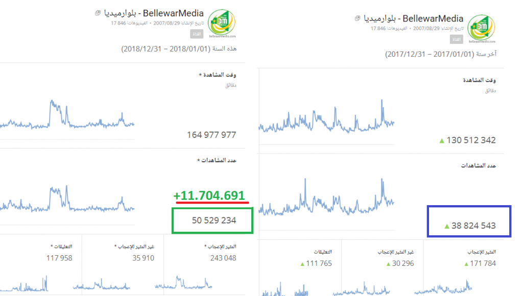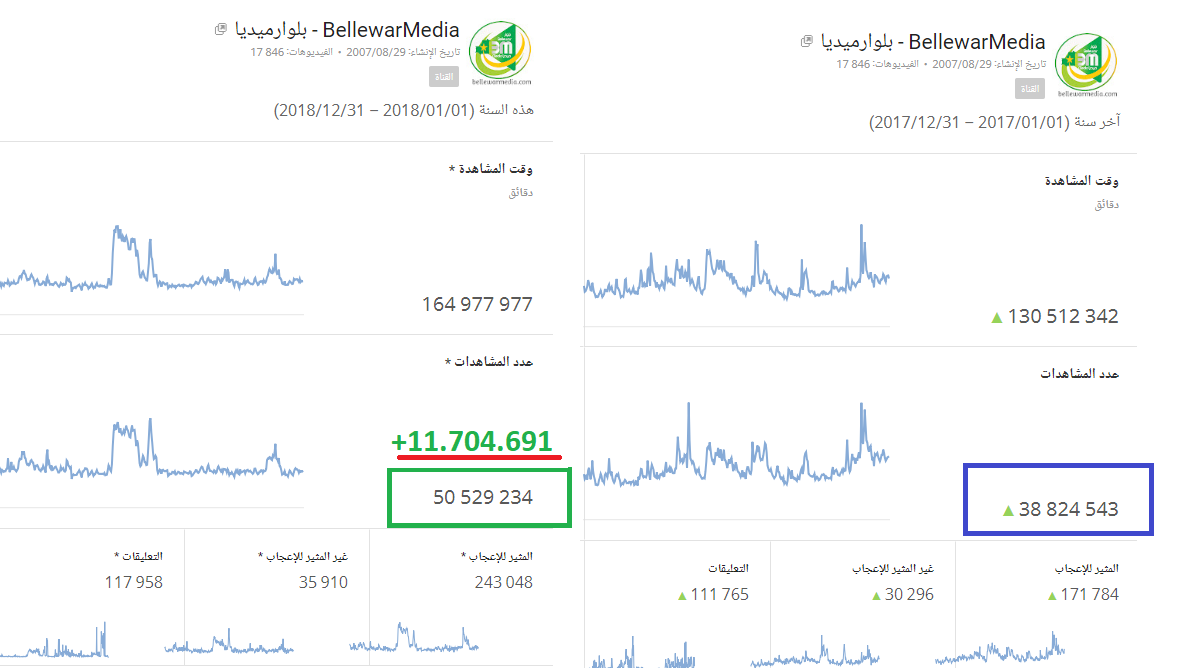 هذا دون احتساب المشاهدة على قناتنا الثانية bellewarmedia والتي بلغت 3.945.825 مشاهدة 2018 و 12.171.510 مشاهد منذ الإنشاء 2009 الى 2018