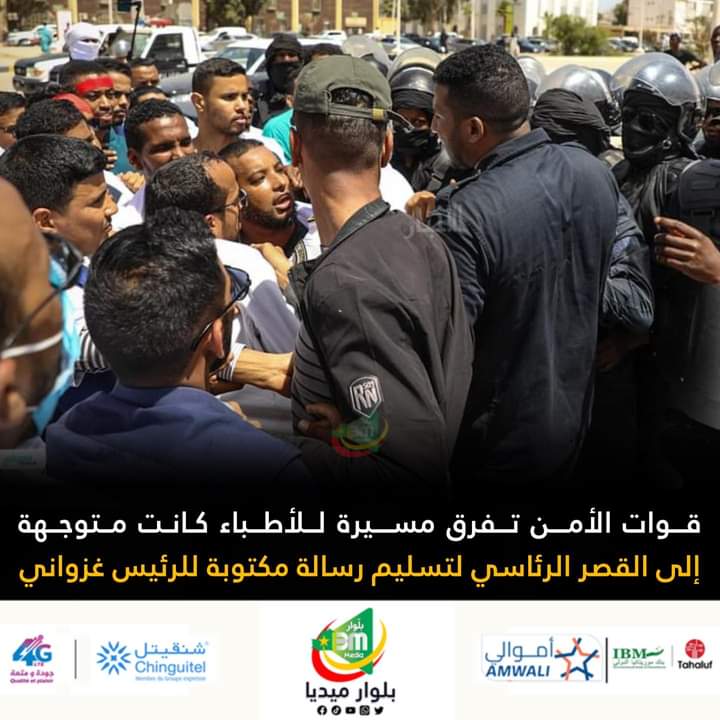 فرقت قوات الأمن الموريتانية اليوم الثلثاء مسيرة نظمها عدد من الأطباء كانت متوجهة إلى القصر الرئاسي، وذلك بهدف تسليم رسالة مكتوبة إلى رئيس الجمهورية محمد ولد الشيخ الغزواني.