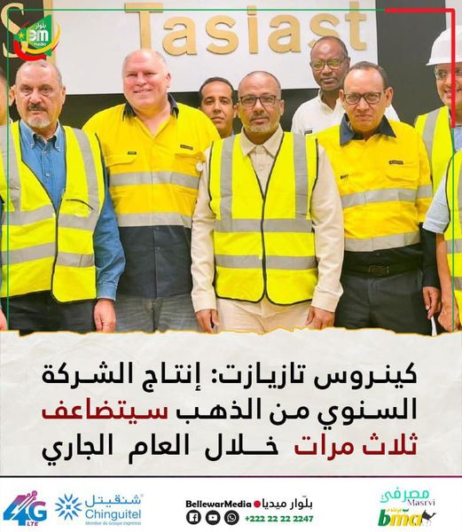 قال رئيس اتحاد أرباب العمل الموريتانيين محمد زين العابدين ولد الشيخ أحمد، إن القائمين على شركة كينروس تازيازت، أكدوا له أن إنتاج الشركة السنوي من الذهب سيتضاعف ثلاث مرات خلال العام الجاري 2022.