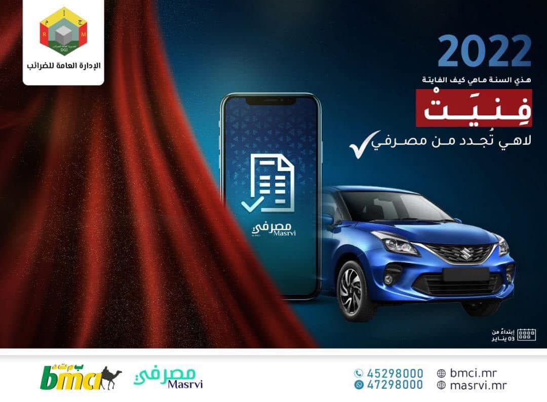 يقدم لكم البنك الموريتاني للتجارة الدولية BMCI، بالشراكة مع الإدارة العامة للضرائب خدمة دفع المخالصة الضريبية السنوية (Vignette) 🚗 من مكانكم عبر مصرفي ابتداء من 3 يناير .