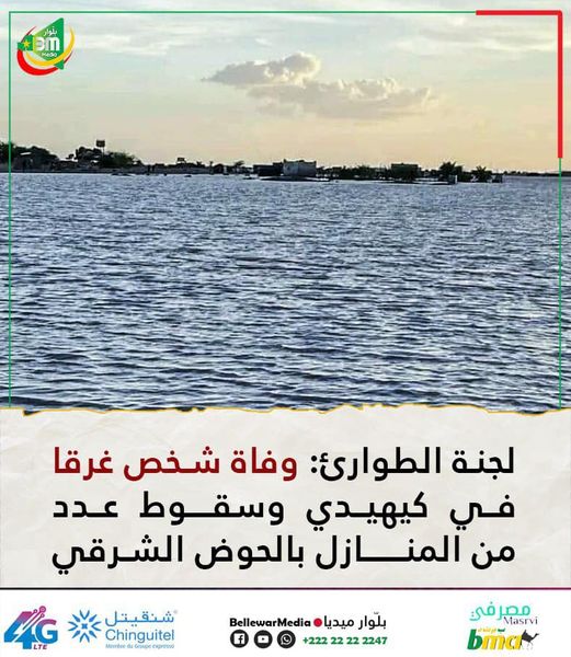 أعلنت اللجنة الوزارية الخاصة بتسيير الطوارئ في نشرتها، اليوم الاثنين، وفاة شخص غرقا في مقاطعة كيهيدي، إضافة إلى سقوط عدد من المنازل الطينية بسبب الأمطار في بعض القرى بولاية الحوض الشرقي.