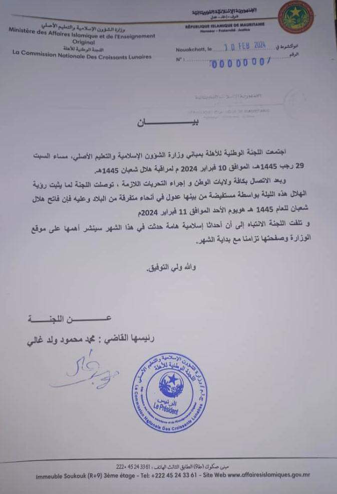 أصدرت اللجنة الوطنية للأهلة بمباني وزارة الشؤون الإسلامية والتعليم الأصلي، بيانا مساء اليوم السبت 29 رجب 1445هـ، الموافق 10 فبراير 2024 م، أعلنت فيه توصلها لما يثبت رؤية الهلال هذه الليلة، بعد الاتصال بكافة ولايات الوطن و إجراء التحريات اللازمة.