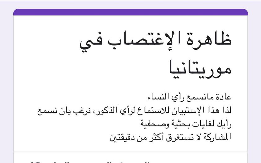 [ad_1] للشباب والرجال فقط؛ نرجو منكم تعبئة الاستبيان بوجهة نظركم حول :" ظاهرة الإغتصاب في موريتانيا". https://forms.gle/8W8ZZ31nshZFhkTU9 [ad_2] Source