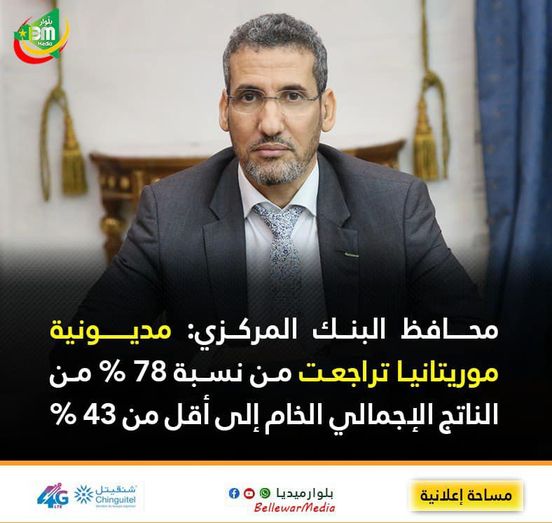 قال محافظ البنك المركزي الموريتاني محمد الأمين ولد الذهبي إن مديونية موريتانيا تراجعت من نسبة 78% من الناتج الإجمالي الخام إلى أقل من 43%.