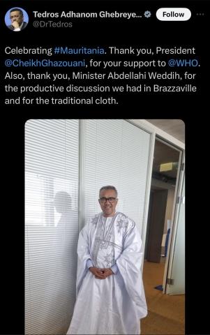 وعبر غيبريسيوس، في تغريدة له على منصة x عن شكره لوزير الصحة؛ البروفسير عبد الله ولد سيدي محمد ولد وديه على المحادثات الذي أجراها معه في برازافيل؛ عاصمة الكونغو، على هامش الدورة الرابعة والسبعين للجنة الإقليمية للمنظمة العالمية للصحة في إفريقيا، وعلى الزي التقليدي (الدراعــة) الذي قدمه له كهدية