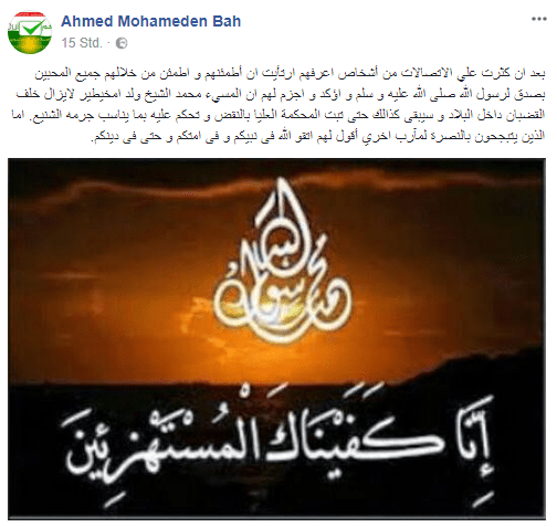 “بعد أن كثرت علي الاتصالات من أشخاص أعرفهم ارتأيت أن أطمئنهم و أطمئن من خلالهم جميع المحبين بصدق لرسول الله صلى الله عليه و سلم و أؤكد وأجزم لهم أن المسيء محمد الشيخ ولد امخيطير لا يزال خلف القضبان داخل البلاد و سيبقى كذلك حتى تبت المحكمة العليا بالنقض وتحكم عليه بما يناسب جرمه الشنيع. أما الذين يتبجحون بالنصرة لمآرب أخرى أقول لهم اتقو الله في نبيكم و في أمتكم و حتى فى دينكم“.