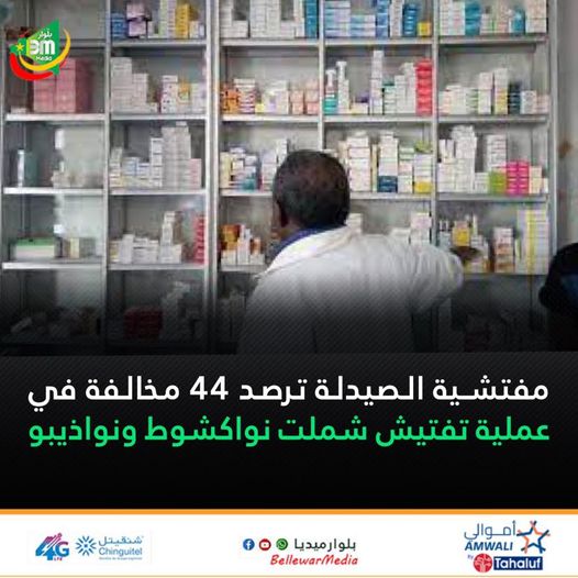 تفتيش في النصف الثاني من شهر أغسطس المنصرم، شملت 98 منشأة صيدلية موزعة على نواكشوط ونواذيبو.وجاءت المخالفات على النحو التالي: