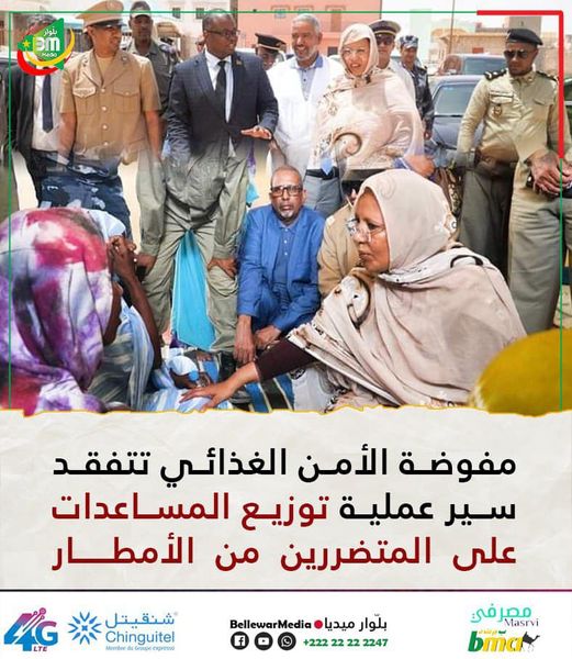 أدت مفوضة الأمن الغذائي فاطمة بنت خطري، اليوم الأربعاء زيارة تفقد واطلاع للمواطنين في المدارس المخصصة للإيواء في الأحياء المتضررة من الأمطار في ولاية نواكشوط الشمالية، ولفرق مفوضية الأمن الغذائي، التي تباشر عملية توزيع المساعدات الغذائية على المواطنين المتضررين في تلك الأحياء.