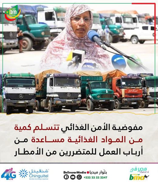 أشرفت مفوضة الأمن الغذائي فاطمة بنت خطري، رفقة معالي وزير التنمية الحيوانية محمد ولد اسويدات، والأمين العام لوزارة الداخلية واللامركزية محمد محفوظ إبراهيم أحمد، اليوم الثلاثاء بساحة المطار القديم بانواكشوط، على حفل استلام كمية من المواد الغذائية، مساهمة من الاتحاد الوطني لأرباب العمل الموريتانيين، في الجهود الرسمية لمساعدة المواطنين المتضررين من الأمطار.