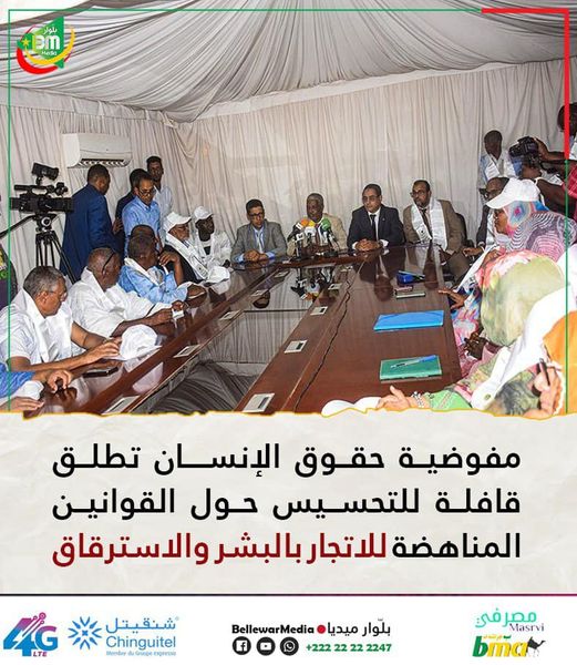 أطلقت مفوضية حقوق الإنسان والعمل الإنساني والعلاقات مع المجتمع المدني اليوم الثلاثاء، من مقر المفوضية قافلة وطنية للتحسيس حول القوانين المناهضة للاتجار بالبشر والاسترقاق والتمييز، تحت شعار “معا.. لصون كرامة الإنسان وحقوقه في كنف دولة القانون”.