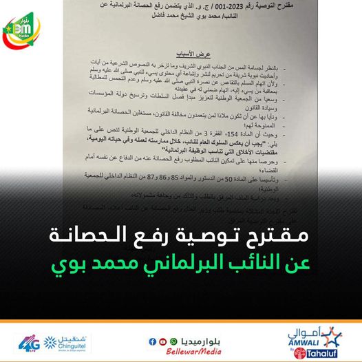 مقترح التوصية رقم 2023-001 / ج . و . ا لذي يتضمن رفع الحصانة البرلمانية عن النائب محمد بوي الشيخ محمد فاضل