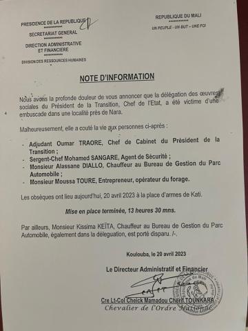 وكشفت الحكومة المالية أن أسماء القتلى هم: الرقيب أول محمد سانغاري وهو وكيل أمن والحسن جالو سائق وموسى توري مقاول وعامل في مجال الحفر لافتة إلى اختفاء كيسيما كيتا وهو سائق في قسم إدارة أسطول نقل الرئاسة.