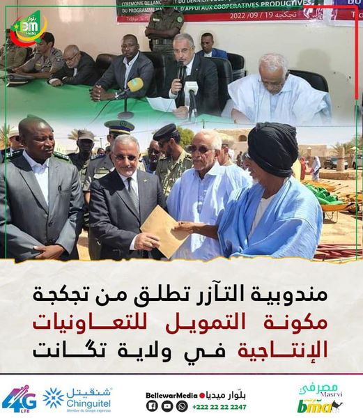 أشرف المندوب العام للتضامن الوطني ومكافحة الاقصاء “التآزر ” محمد عالي ولد سيدي محمد، رفقة والي تگانت حدادي أمبارى ياتيرا، زوال اليوم الإثنين ، بمدينة تجكجة على إطلاق مكونة التمويل والمتابعة للتعاونيات الإنتاجية على مستوى ولاية تگانت، وذلك في إطار برنامج وطني تنفذه مندوبية التآزر يتجاوز تمويله 650 مليون أوقية قديمة، وتستفيد منه أكثر من300 تعاونية إنتاجية في كل ولايات الوطن.