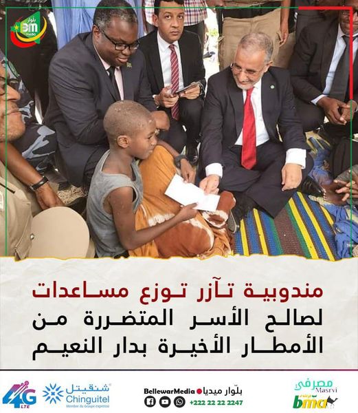 وحسب مندوبية تآزر، ستستفيد من هذه المساعدات 1000 أسرة تضررت من الأمطار الأخيرة بمقاطعة دار النعيم، وستحصل كل أسرة على 50000 اوقية قديمة.