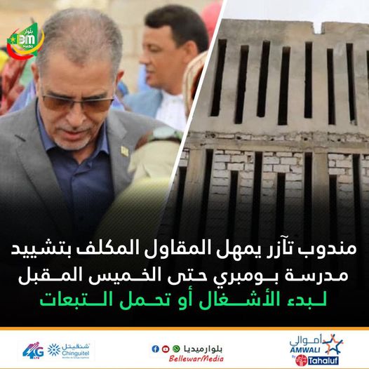 التابعة لبلدية أمبلله بمقاطعة كرمسين في ولاية أترارزة” حتى يوم الخميس لبد الأشغال أو تحمل العواقب التي تترتب على عدم تقييده بالشروط الواردة في دفتر الالتزامات المتعلقة ببناء هذه المدرسة”.جاء هذا الإنذار على هامش الزيارة التي أداها المندوب العام رفقة والي أترارزة السيد محمد ولد أحمد مولود صباح اليوم الاثنين للمدرسة الابتدائية قيد الانشاء بقرية بومبري التابعة لبلدية أمبلله بمقاطعة كرمسين في ولاية أترارزة.