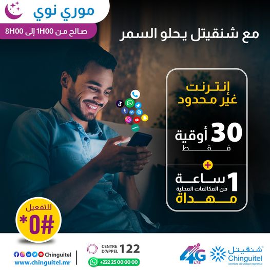 #موري_نوي 🤩 إنترنت غير محدود على شبكة الـ4G و الـ3G بالإضافة إلى 60 دقيقة من المكالمات المحلية، صالحة من الساعة الـ 01:00 بعد منتصف الليل حتي 08:00 صباحا بـ30 أوقية فقط. العرض متاح طوال ليالي الأسبوع😊
