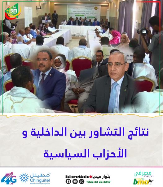 بإشراف من معالي وزير الداخلية واللامركزية، السيد محمد أحمد ولد محمد الأمين، توجت المشاورات الجارية منذ فترة بين وزارة الداخلية واللامركزية والأحزاب السياسية حول التحضير التشاركي والتوافقي للانتخابات البلدية والجهوية والنيابية بالإتفاق على مقترح تقدم به معالي الوزير، يشمل النقاط التالية: