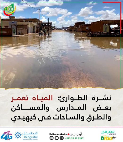وسجلت النشرة ارتفاع منسوب مياه النهر في مركز لكصيبة بولاية اترارزة إلى 5 م و 45 سم.