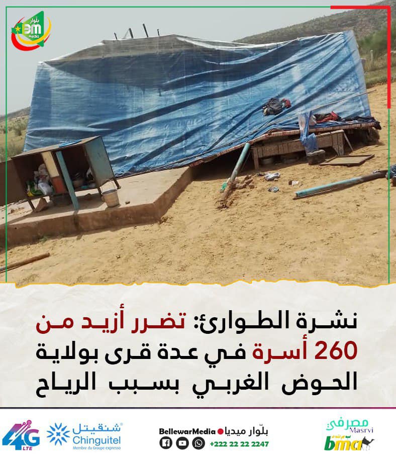 أعلنت وزارة الداخلية تضرر أزيد من 260 أسرة في عدة قرى بولاية الحوض الغربي بسبب الرياح، كما اصيبت سيدة وطفل بجروح بسيطة.