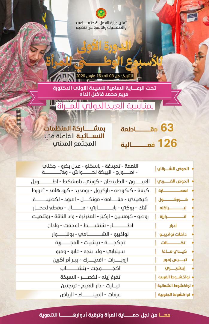 أعلنت وزارة العمل الاجتماعي والطفولة والأسرة عن تنظيم الدورة الأولى من “الأسبوع الوطني للمرأة”، وذلك تحت الرعاية السامية للسيدة الأولى مريم محمد فاضل الداه، بمناسبة تخليد اليوم الدولي للمرأة.
