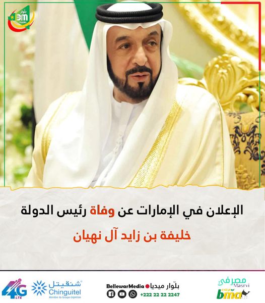 نعت وزارة شؤون الرئاسة الإماراتية، إلى شعب دولة الإمارات والأمتين العربية والإسلامية، والعالم أجمع، الشيخ خليفة بن زايد آل نهيان رئيس الدولة الذي تُوفي اليوم الجمعة 13 مايو.