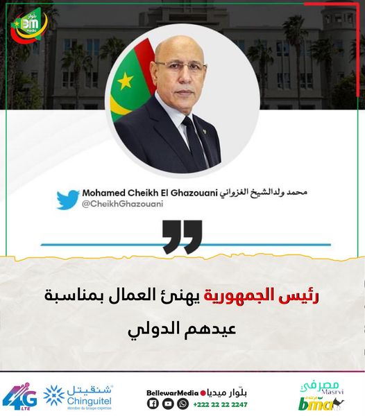 هنأ رئيس الجمهورية محمد ولد الشيخ الغزواني العمال الوطنيين ، بمناسبة عيدهم الدولي الذي يصادف اليوم ، فاتح شهر مايو .