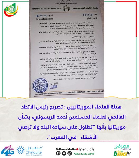 هيئة العلماء الموريتانيين : تصريح رئيس الاتحاد العالمي لعلماء المسلمين أحمد الريسوني، بشأن موريتانيا بأنها “تطاول على سيادة البلد ولا ترضي الأشقاء في المغرب”.