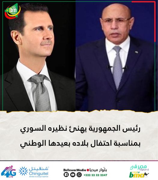 وجه رئيس الجمهورية محمد ولد الشيخ الغزواني رقية تهنئنة إلى بشار الأسد، رئيس الجمهورية العربية السورية، بمناسبة احتفال بلاده بعيدها الوطني.