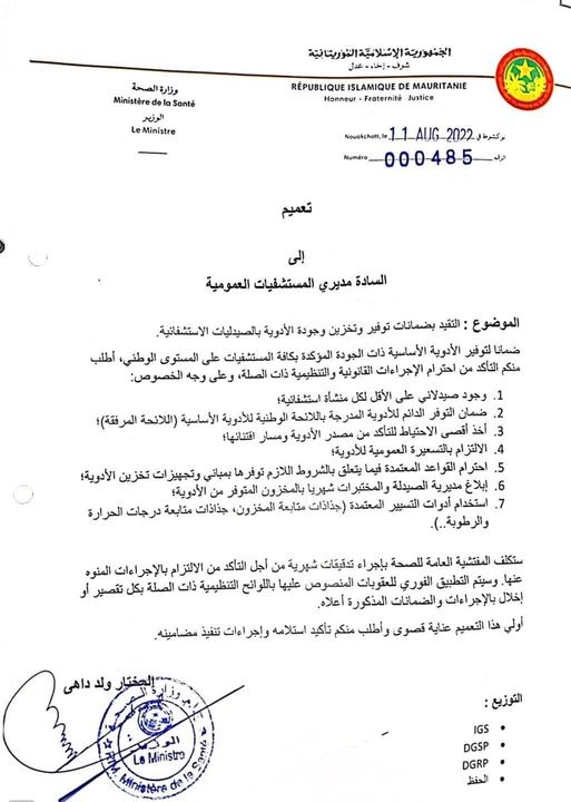 وجه معالي وزير الصحة السيد المختار ولد داهي تعميما إلى مديري المستشفيات العمومية بشأن التقيد بضمانات توفير وتخزين وجودة الأدوية بالصيدليات الاستشفائية، وذلك ضمانا لتوفير الأدوية الأساسية ذات الجودة المؤكدة بكافة المستشفيات على المستوى الوطني.