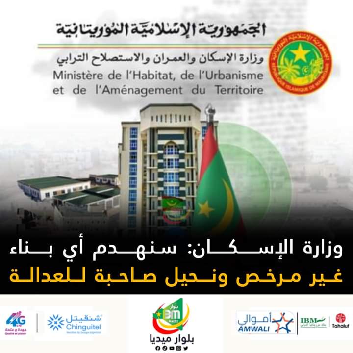 أعلنت وزارة الإسكان والعمران والاستصلاح الترابي الموريتانية، أن مصالح الرقابة الحضرية ستهدم أي بناء غير مرخص، أو احتلال المجال العمومي.