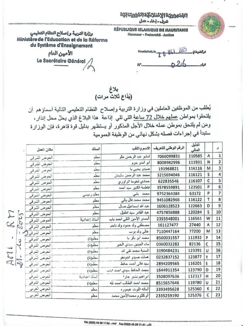 وأوضح البلاغ، الصادر أمس الإثنين والموقّع من طرف الأمين العام لوزارة التربية وإصلاح النظام التعليمي يحي بوب الطالب، والأمين العام لوزارة الثقافة والاتصال والعلاقات مع البرلمان سيدي محمد جدو خطري، أن المهلة المحددة تمنح المعنيين فرصة العودة إلى أماكن عملهم أو تقديم ما يثبت وجود قوة قاهرة حالت دون مباشرتهم لمهامهم.