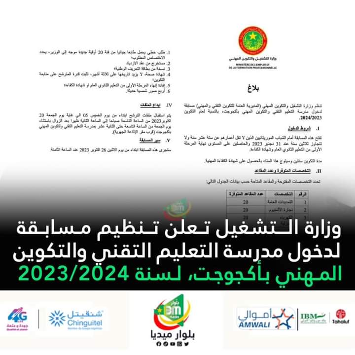 أعلنت وزارة التشغيل والتكوين المهني (المديرية العامة للتكوين التقني والمهني) تنظيم مسابقة لدخول مدرسة التعليم التقني والتكوين المهني بأكجوجت، بالنسبة لعام التكوين 2023/2024.