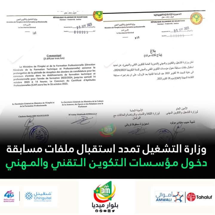 أعلنت وزارة التشغيل والتكوين والمهني (المديرية العامة للتكوين التقني والمهني،) عن تمديد استقبال ملفات مسابقة دخول مؤسسات التكوين التقني والمهني للسنة التكوينية 2024/2023 الى غاية السبت 14 أكتوبر 2023 عند الساعة الثانية بعد الزوال على ان يتم إجراء مسابقة الكفاءة المهنية (CAP) يوم 26 اكتوبر 2023.