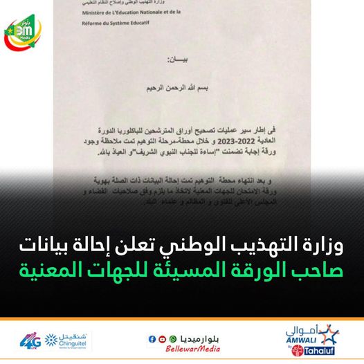 أعلنت وزارة التهذيب الوطني وإصلاح النظام التعليمي أنها أحالت “البيانات ذات الصلة بهوية ورقة الامتحان للجهات المعنية لاتخاذ مايلزم وفق صلاحيات القضاء والمجلس الأعلى للفتوى والمظالم وعلما البلد.