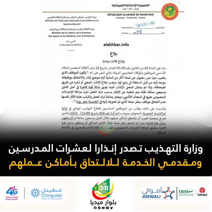 أصدرت وزارة التهذيب الوطني وإصلاح النظام التعليمي؛ إنذارا لعشرات المدرسين، ومقدمي خدمة التعليم للالتحاق بأماكن عملهم خلال 72.