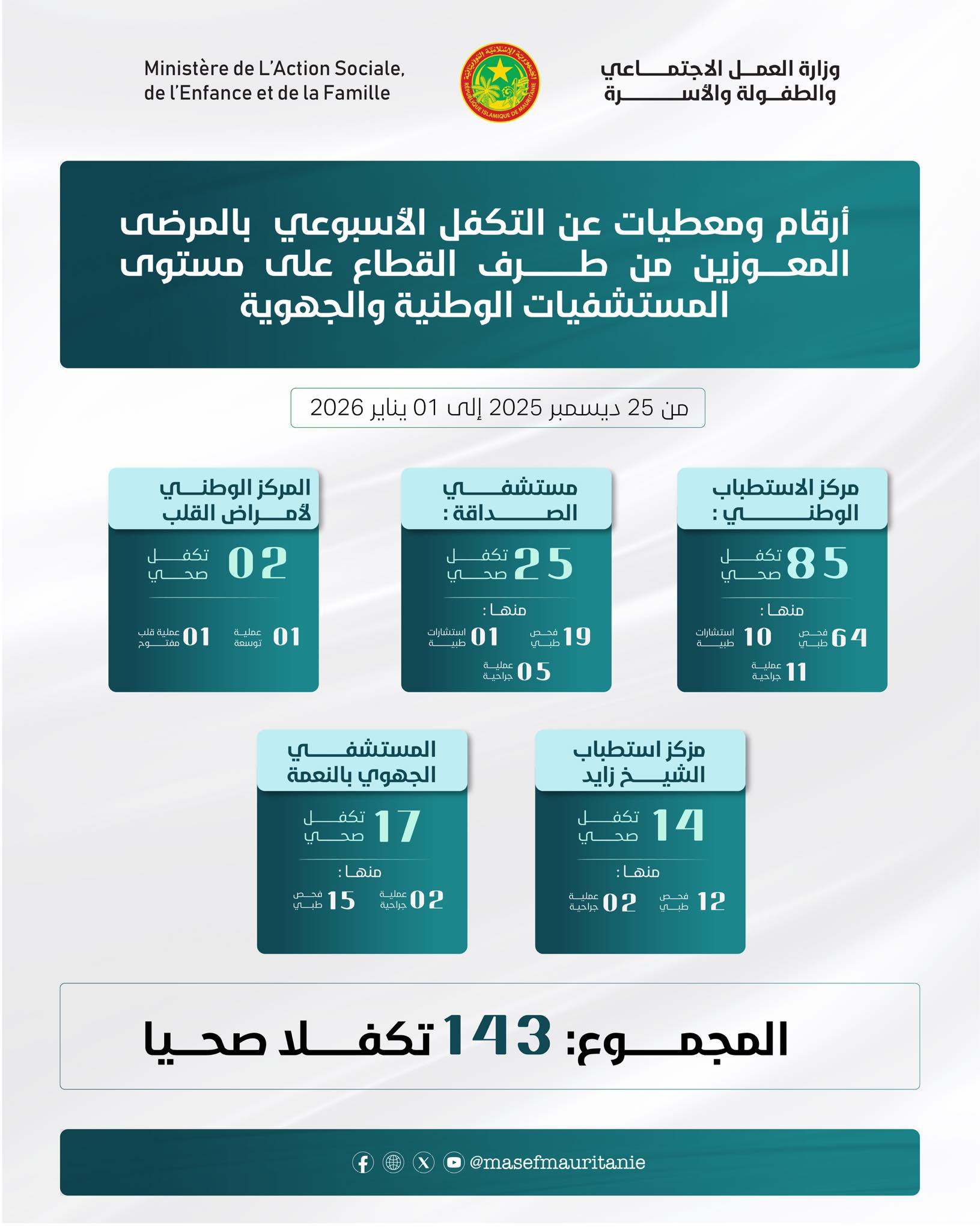 أعلنت وزارة العمل الاجتماعي والطفولة والأسرة أنها تكفلت، خلال الأسبوع الماضي، بعلاج 143 مريضاً من المعوزين في عدد من المستشفيات الوطنية والجهوية.