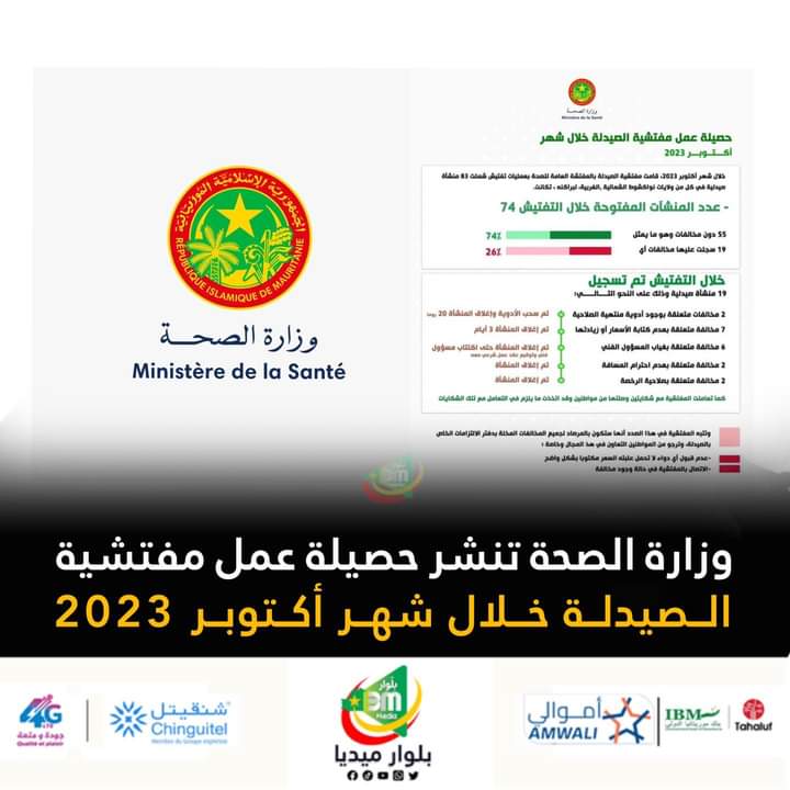 نشرت وزارة الصحة حصيلة عمليات تفتيش شملت 83 منشأة صيدلية خلال شهر أكتوبر 2023، في كل من ولايات نواكشوط الشمالية ,الغربية، لبراكنه ، تكانت.