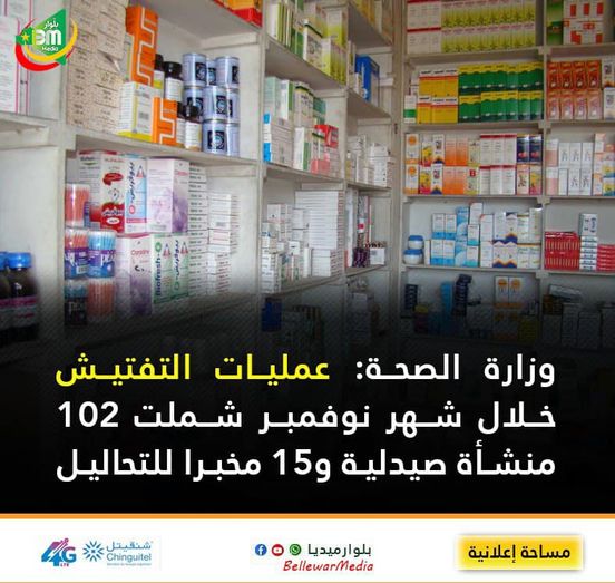 أعلنت وزارة الصحة عن حصيلة عمليات التفتيش التي قامت بها مفتشية الصيدلة بالمفتشية العامة للصحة، خلال شهر نوفمبر، بولاية الحوض الغربي، وولايات انواكشوط الثلاث.