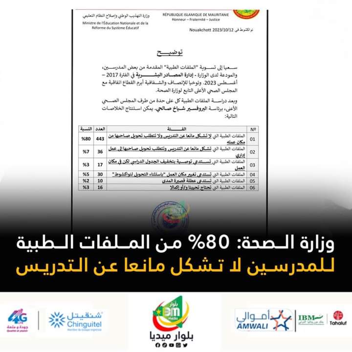 أعلنت وزارة الصحة أن 80% من الملفات الطبية التي قدمها بعض المدرسين في الفترة مابين 2017 – 2023 لا تشكل مانعا عن التدريس ولا تتطلب تحويل صاحبها من مكان عمله.