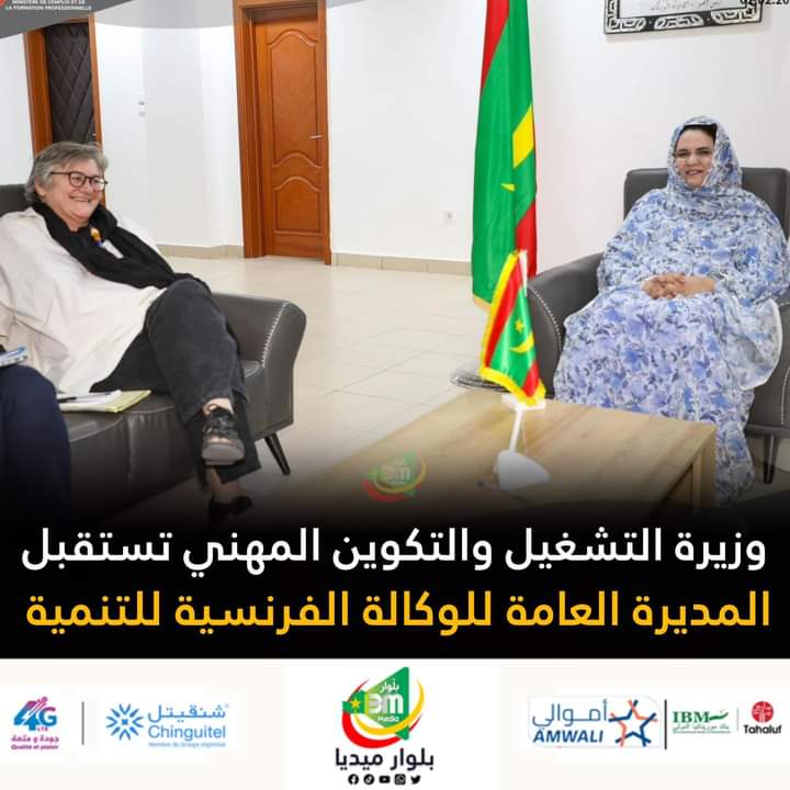 استقبلت وزيرة التشغيل والتكوين المهني، السيدة زينب منت أحمدناه، اليوم الخميس الموافق 01 فبراير 2024، المديرة العامة للوكالة الفرنسية للتنمية بموريتانيا السيدة بينيديكت بروسيه مرفوقة بنائب الوكالة السيدة كلير جالانتي.