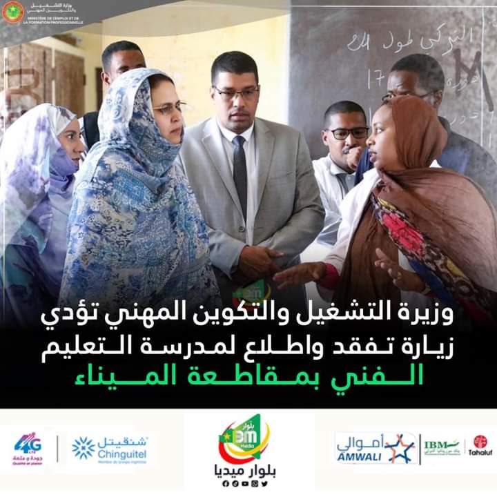 أدت وزيرة التشغيل والتكوين المهني زينب بنت أحمدناه زيارة تفقد واطلاع لمدرسة التعليم الفني والتكوين المهني للبناء والأشغال العامة بمقاطعة الميناء، إذ توفر هذه المدرسة التكوين في العديد من التخصصات لتلبية احتياجات سوق العمل في قطاع البناء. كما تقدم أيضًا التكوين من خلال التَّعلّم.
