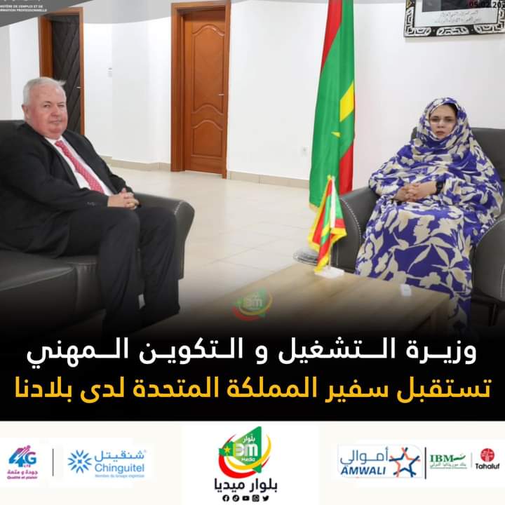 استقبلت وزيرة التشغيل والتكوين المهني السيدة زينب منت أحمدناه، اليوم الاثنين الموافق 05 فبراير 2024، سعادة سفير المملكة المتحدة السيد كولين ويلز.